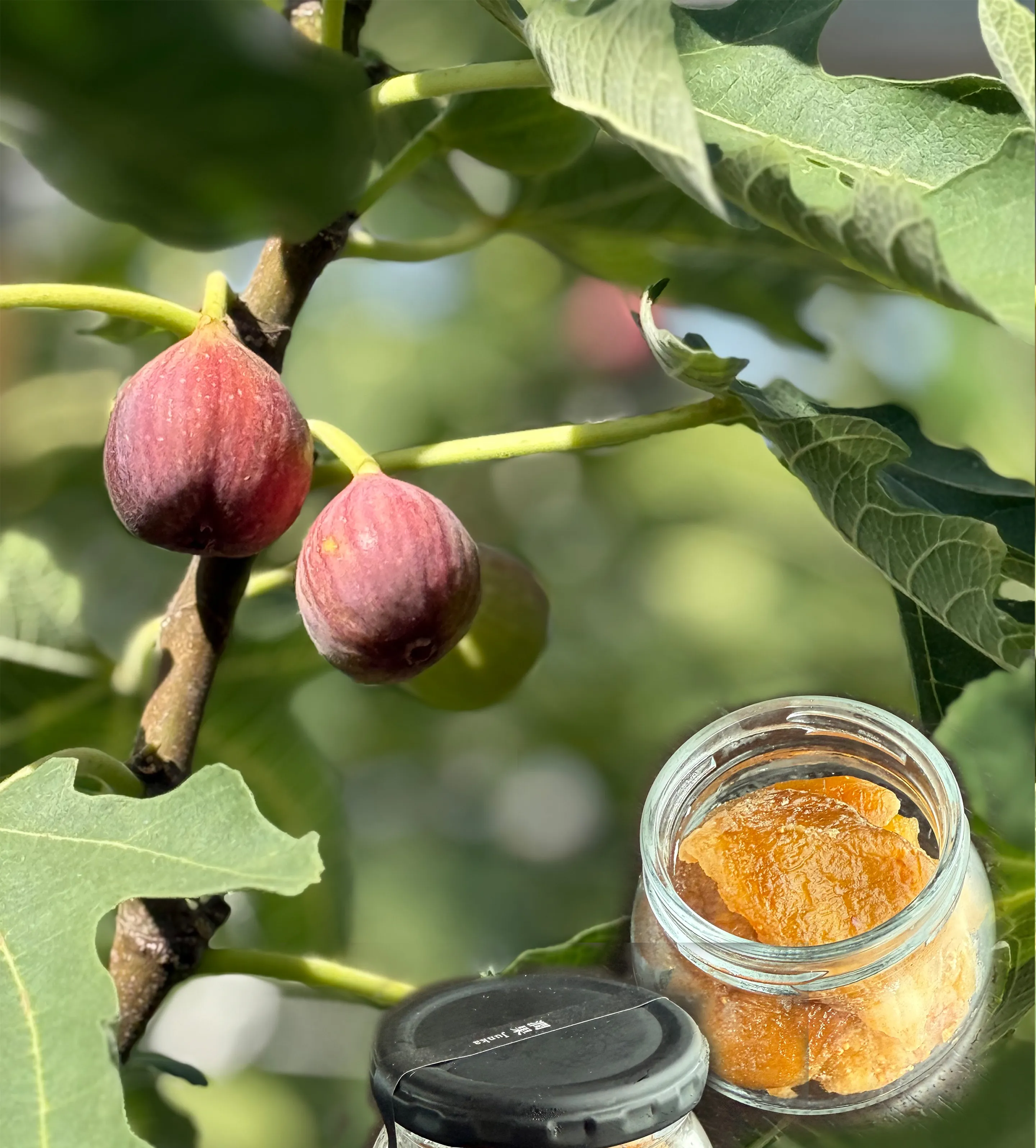 生のいちじくを食べているような食感を残すため、潤果はとよみつ姫を大粒に切り分け、皮付きで果肉のつぶを残しています。果物由来のブドウ糖液糖をつかうことで、体にやさしく、つやのある飴色に仕上がります。