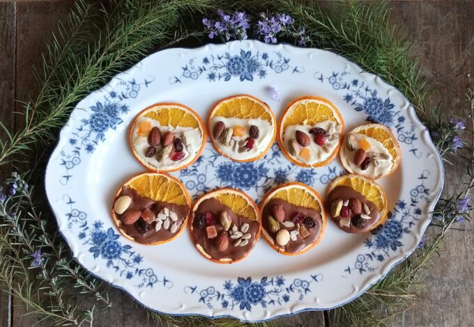 マンディアンとは チョコレートを薄い円形にのばし、ナッツ類やドライフルーツをトッピングしたチョコレート菓子です。いちかのネーブルオレンジのドライをマンディアントレーに使うと 簡単できれいなマンディアンを作ることができます♪