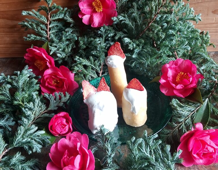 - お皿に④を立て、生地の上に生クリームをスプーンですくってのせ、苺のドライフルーツを飾ります。 お好みで生地全体に生クリームを塗ったり、キャンドルが溶けるように生クリームを垂らしてみたり、とアレンジしてみましょう。