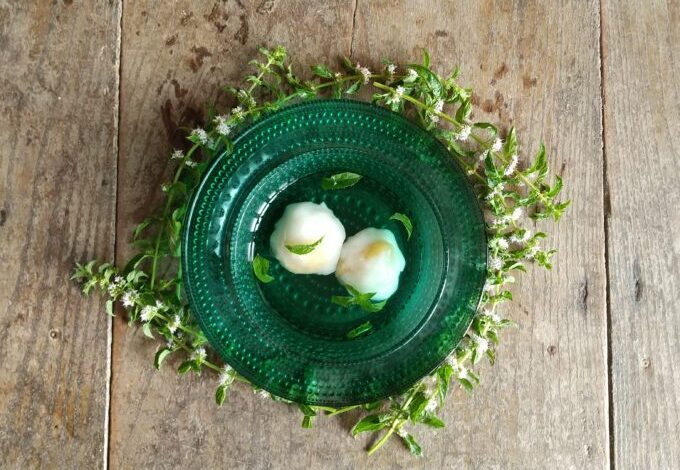- 容器に葛まんじゅうを入れて、モロッコ風ミントティを注ぎ、ミント飾ったら出来上がりです。