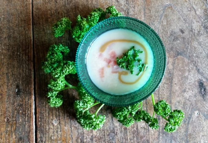 - 器に②を注ぎ、みじん切りのした生ハム・パセリを飾り、練りごまを回し入れたら出来上がりです。